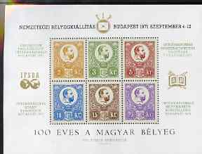 Hungary 1971 Budapest '71 Stamp Exhibition imperf souvenir sheetlet containing images of 1871 set of 6, unmounted mint