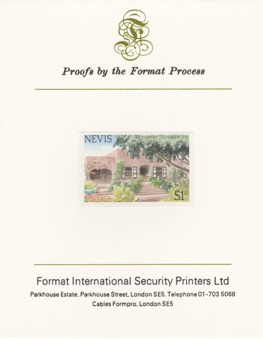 Nevis 1985 Tourism (2nd series) $1.20 (Montpelier Plantation Inn) imperf proof mounted on Format International proof card as SG 246
