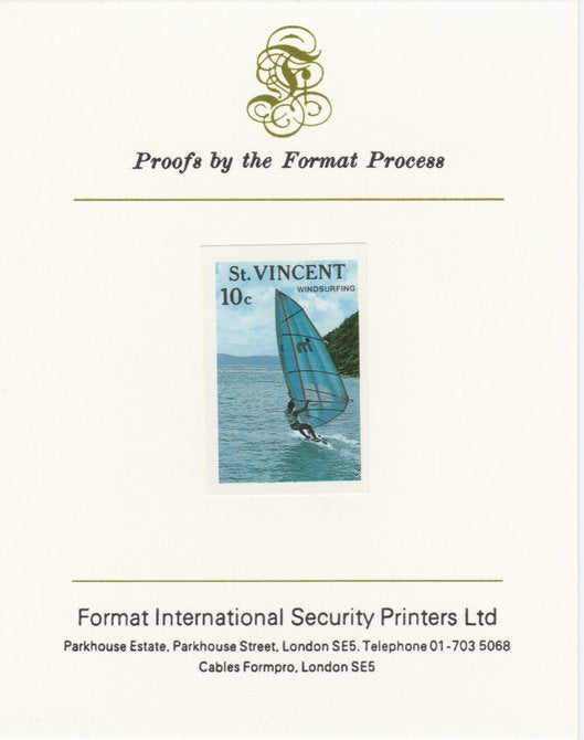 St Vincent 1988 Tourism 10c Windsurfing imperf mounted on Format International proof card, as SG 1133