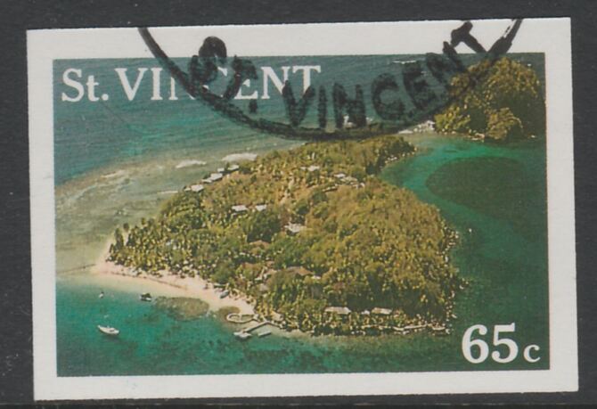 St Vincent 1988 Tourism 65c Aerial View of Young Island imperf proof in 3 colours only (magenta, cyan & yellow only), fine used with part St Vincent cancellation, produced for a promotion. Ex Format International archives (as SG 1135)