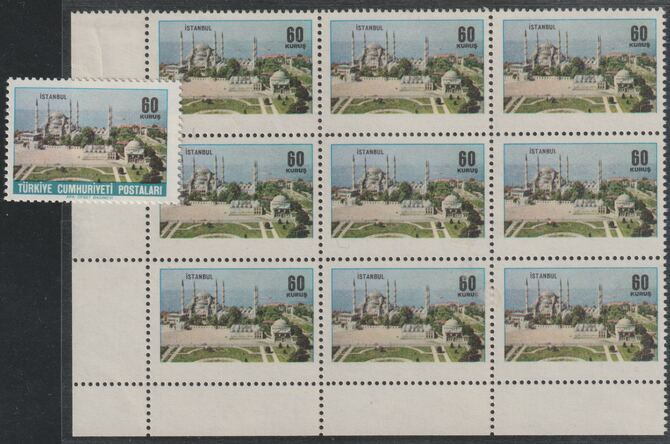 Turkey 1965 Istanbul 60k impressive corner block of 9 with blue (Country name) omitted, as SG 2092, some gum disturbances but believed to be one of the largest blocks extant complete with normal single.