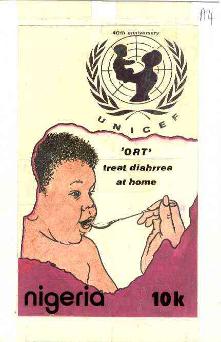 Nigeria 1986 UN's Children's Fund - original hand-painted artwork for 10k value (showing Oral Rehydration Therapy) by Francis Nwaije Isibor on card 120 x 200mm with overlay endorsed A4