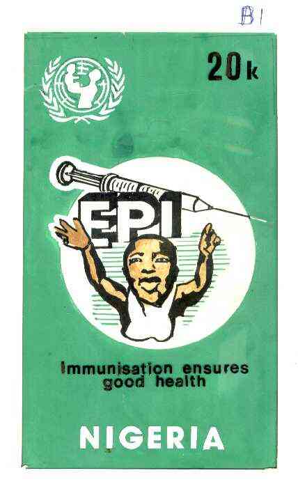 Nigeria 1986 UN's Children's Fund - original hand-painted artwork for 20k value (showing Child & Hyperdermic needle) by Godrick N Osuji on card 125 x 220mm endorsed B1