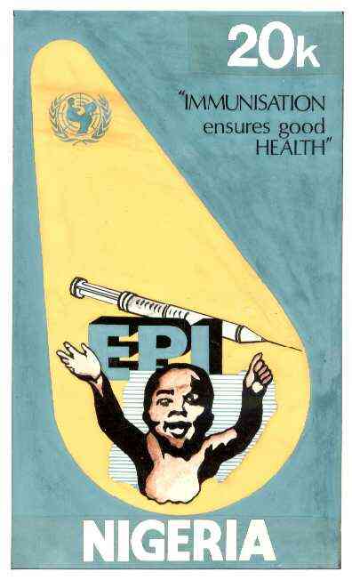 Nigeria 1986 UN's Children's Fund - original hand-painted artwork for 20k value (showing Child & Hyperdermic needle) by NSP&MCo Staff Artist Clement O Ogbebor on card 130 x 220mm endorsed B7