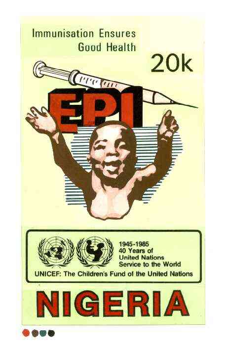 Nigeria 1986 UN's Children's Fund - original hand-painted artwork for 20k value (showing Child & Hyperdermic needle) similar to issued stamp on card 130 x 225mm endorsed B6