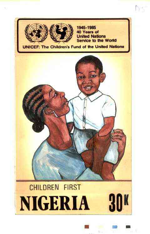 Nigeria 1986 UN's Children's Fund - original hand-painted artwork for 30k value (showing Mother & Child) by NSP&MCo Staff Artist Mrs A O Adeyeye on card 130 x 220mm endorsed D5
