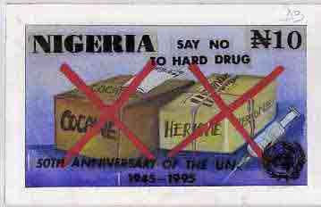 Nigeria 1995 50th Anniversary of United Nations - original hand-painted artwork for N10 value by Remi Adeyemi (Say No To Hard Drugs) on board 8.5" x 5" endorsed D3