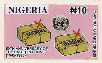 Nigeria 1995 50th Anniversary of United Nations - original hand-painted artwork for N10 value (Say No To Hard Drugs) on board 8.5" x 5" endorsed D2