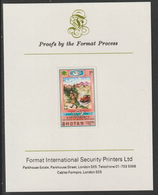 Bhutan 1974 Centenary of Universal Postal Union 1nu Mail Runner & Jeep imperf mounted on Format International proof card, as SG 288