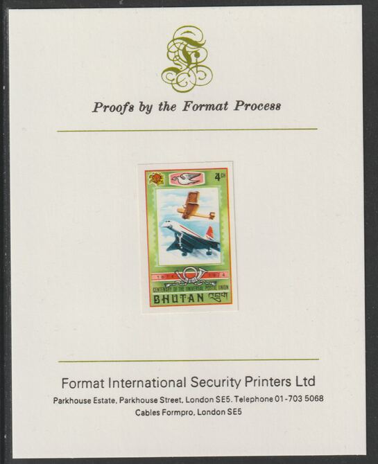 Bhutan 1974 Centenary of Universal Postal Union 4ch Vickers Vimy & Concorde imperf mounted on Format International proof card, as SG 286