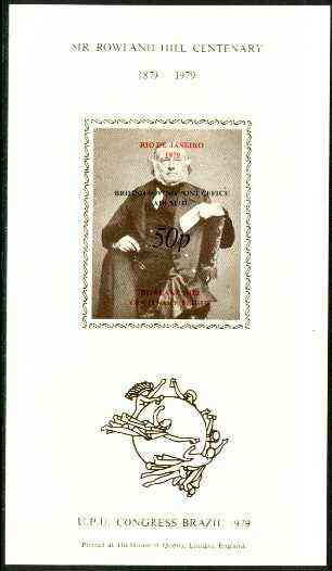Brazil 1979 UPU Rowland Hill imperf souvenir sheet overprinted 'British Flying Post Office, Air Mail 50p' in black additionally opt'd 'Rio de Janeiro, Rowland Hill Centenary Flight' in red unmounted mint