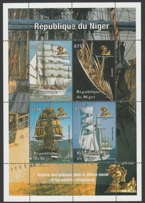 Niger Republic 1998 Tall Ships perf sheetletcontaining 4 values each with 150th Anniv of UPU imprint unmounted mint. Note this item is privately produced and is offered purely on its thematic appeal, it has no postal validity