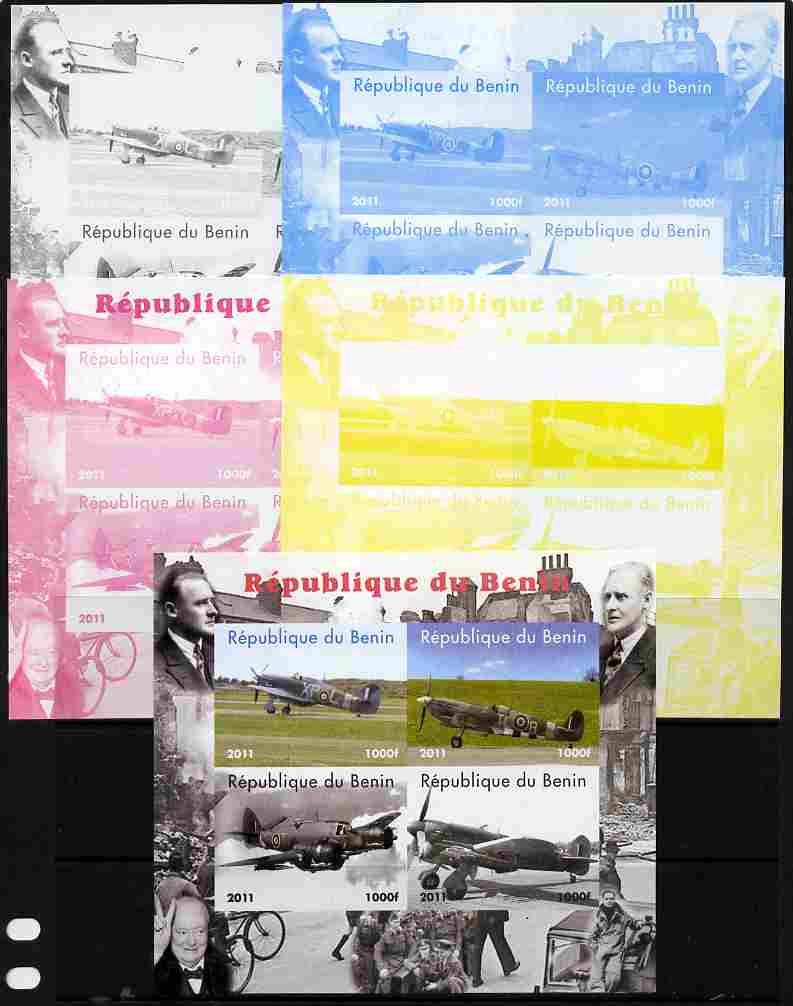 Benin 2011 Aircraft of WW2 (Churchill & Spitfires) sheetlet containing 4 values - the set of 5 imperf progressive proofs comprising the 4 individual colours plus all 4-colour composite, unmounted mint