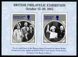 Exhibition souvenir sheet for 1985 British Philatelic Exhibition showing imperf Queen Mother stamps from Falklands & Solomon Is, unmounted mint