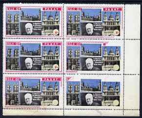 Pabay 1968 Churchill 5s perf corner block of 6, 4 stamps showing part of red printing omitted due to paper fold (3 stamps with no face value) unmounted mint but sl soiling mainly a a result of the fold.
