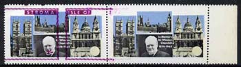 Stroma 1968 Churchill 2s horiz pair with purple (frame, name & value) misplaced on one stamp and omitted on the other (slight set-off on gummed side and minor wrinkles probably due to paper jam which caused the error)