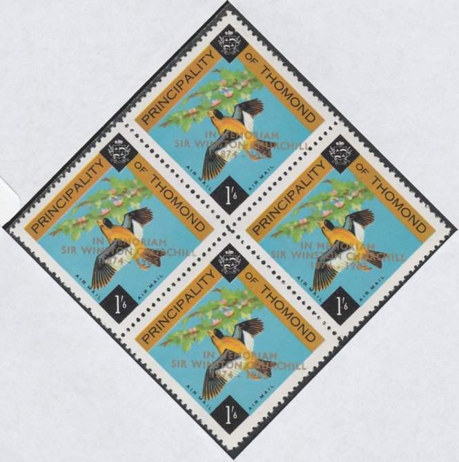 Thomond 1965 Bird 1s6d (Diamond shaped) with 'Sir Winston Churchill - In Memorial' overprinted in gold unmounted mint block of 4, slight off-set from overprint on gummed side