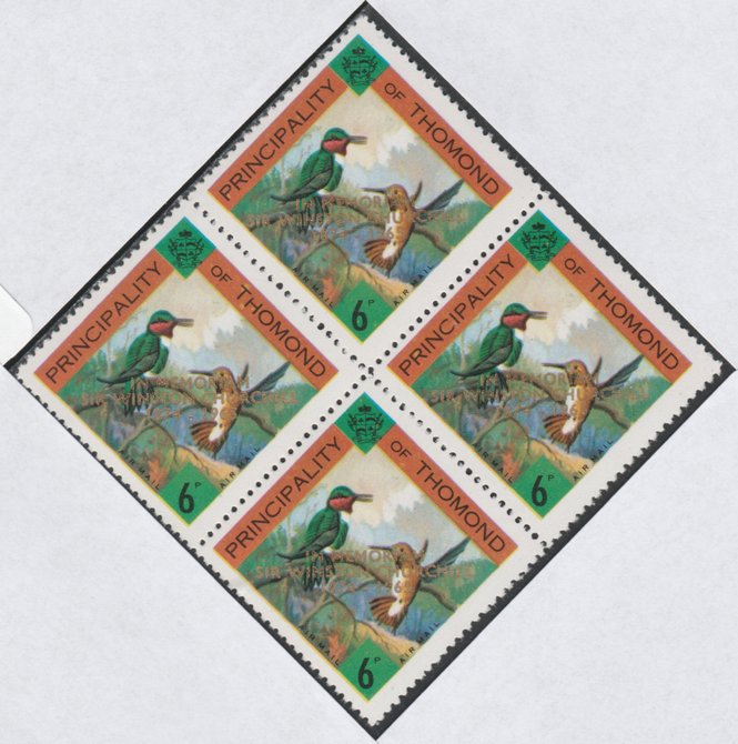Thomond 1965 Humming Birds 6d (Diamond-shaped) with 'Sir Winston Churchill - In Memorium' overprint in gold unmounted mint block of 4, slight off-set from overprint on gummed side