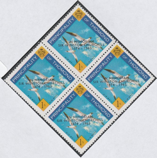 Thomond 1965 Sea Gulls 1s (Diamond shaped) with 'Sir Winston Churchill - In Memorium' overprint in black unmounted mint block of 4, slight off-set from overprint on gummed side