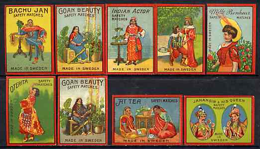 Match Box Labels - complete set of 9 Indian Tea Ladies superb unused condition (Swedish)
