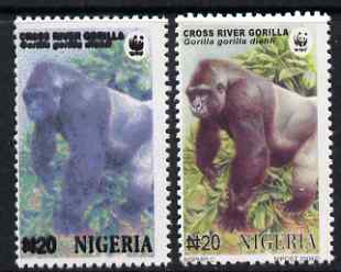 Nigeria 2008 WWF - Gorilla N20 perf essay trial with an overal bluish colour, very thick lettering and without imprint complete with normal for comparison, unmounted mint but some ink offset.,Very few produced